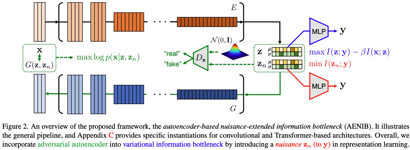 이 문제를 해결하기 위해 저자들은 '정보 병목(Information Bottleneck, IB)' 원칙을 확장하여 '불필요 정보(Nuisance Information)' 라는 개념을 도입합니다. 모델이 이미지를 분류하는 데 꼭 필요한 핵심 정보(z)와, 분류에는 불필요하지만 이미지를 구성하는 나머지 정보(z_n, 예: 배경, 조명, 질감 등)를 명확히 분리하도록 학습시키는 새로운 프레임워크 NIB(Nuisance-extended Information Bottleneck)를 제안합니다.