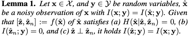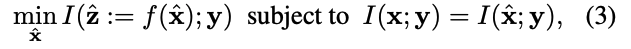 ‘\(\max_{f,g}\; I(z; y) + I(x; z_n, y) - I(z_n; z)\)’ (11)