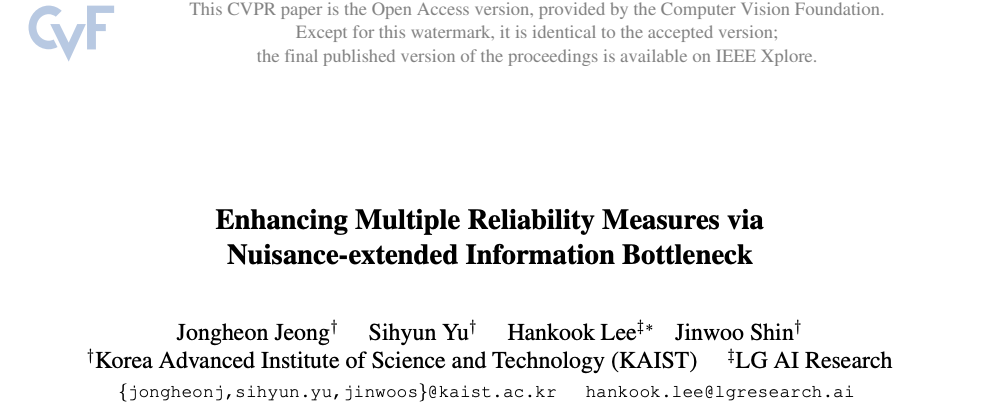 본 논문에서는 domain-specific task에 대한 prior를 가정하지 않고 model reliability를 목표로 하는 새로운 training objective인 nuisance-extended information bottleneck(NIB)을 제안함.