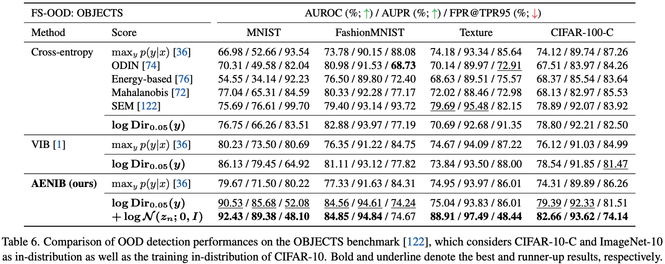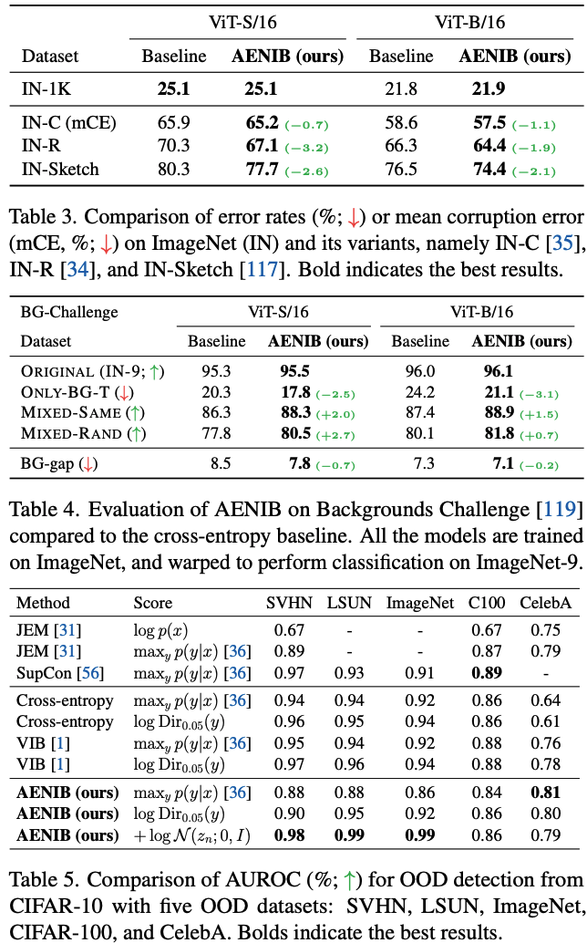 마지막으로 Table 4는 Background Challenge [119]에서 ImageNet classifier를 추가로 평가함. 이 benchmark는 background shift에 대한 model robustness를 테스트하기 위해 만들어졌으며, 구체적으로 ImageNet-9(ORIGINAL, ImageNet의 370개 subclass를 결합함)의 variant를 서로 다른 background 조합으로 구성함. AENIB 기반 model은 이 benchmark에서도 cross-entropy baseline 대비 일관되게 성능을 개선하며, AENIB가 background change에 덜 biased된 feature를 학습하는 경향이 있음을 보여줌.