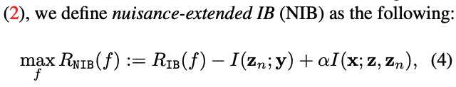 이에 따라 standard Information Bottleneck(IB)를 확장하여 nuisance information을 추가적으로 모델링하도록 설계함.