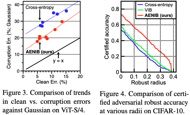 Table 1과 2는 CIFAR 기반 model 결과를 요약함. Table 1에서 AENIB가 VIB 대비 corruption error를 유의미하고 일관되게 개선함을 관찰함. 또한 이러한 gain은 state-of-the-art 방법들과 비교해도 강력함. 예를 들어 AENIB만으로도 강력한 baseline인 AugMix [39]를 outperform 가능함. 더 최근 방법인 PixMix [40]는 extra (pattern-like) data를 활용해 더 낮은 corruption error를 달성할 수 있지만, (a) “AENIB + PixMix”에서 보이듯 AENIB도 PixMix(즉 extra data)로부터 이득을 얻으며, (b) Table 2 결과는 AENIB의 generalization capability가 CIFAR-10.1, 10.2, CINIC-10에서 PixMix보다 더 좋음을 보여줌. 즉, domain-specific data에 덜 의존하면서 common corruption을 넘어선 영역에서도 더 잘 generalize함.