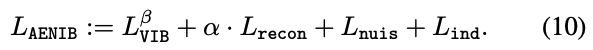‘\(L_{\text{AENIB}} := L_{\text{VIB}}^{\beta} + \gamma \cdot L_{\text{recon}} + L_{\text{nuis}} + L_{\text{ind}}\)’ (10)