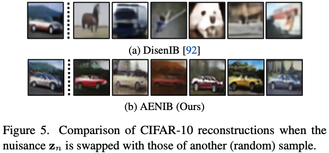 전반적으로 AENIB의 효과가 이러한 benchmark들에서도 여전히 적용됨을 관찰함. 이는 DisenIB와 대조적임. DisenIB의 효과는 예를 들어 [92]가 수행한 Gaussian noise를 OOD로 탐지하는 AUROC gain처럼 특정 설정에서는 보일 수 있으나, CIFAR-10-C나 MNIST-C로는 더 이상 일반화되지 못했기 때문임. 반면 AENIB는 이러한 corrupted benchmark에서도 여전히 개선을 보이며, 동일한 OOD task에서 perfect score도 달성함. Figure 5a에서는 DisenIB가 nuisance ‘\(z_n\)’에 highly semantic한 정보를 자주 남기는 것을 정성적으로도 관찰함. 즉, reconstruction이 다른 sample의 ‘\(z_n\)’과 swap하는 것만으로도 완전히 바뀔 수 있음. 이는 Figure 5b에서 비교하듯, AENIB가 본질적으로 해결하려는 문제임.