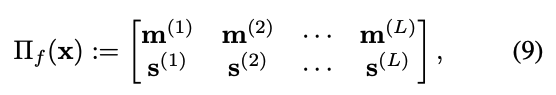 ‘\(\Pi_f(x) := \begin{bmatrix} m^{(1)} & m^{(2)} & \cdots & m^{(L)} \\ s^{(1)} & s^{(2)} & \cdots & s^{(L)} \end{bmatrix}\)’ (9)