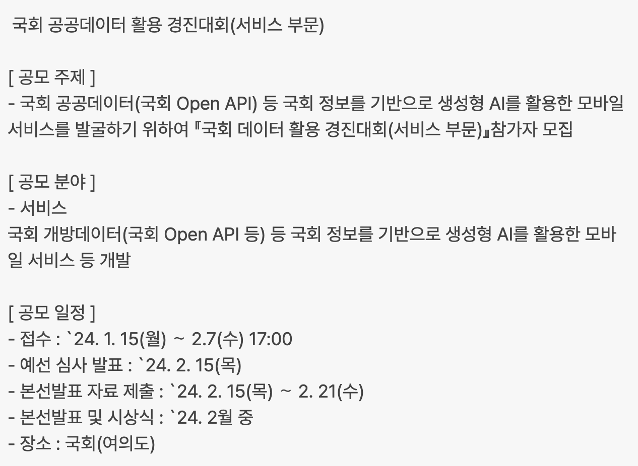 국회 개방데이터(국회 Open API 등) 등 국회 정보, 모바일 서비스 아이디어 및 생성형 AI를 활용한
