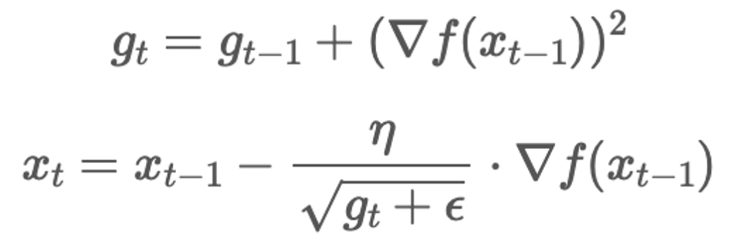 1. 기울기 제곱의 누적합: 각 파라미터에 대해 과거 기울기의 제곱을 누적하여 학습률을 조정한다. 시간 t에서의 파라미터 x의 기울기 f_t-1에 대해 누적합 g_t는