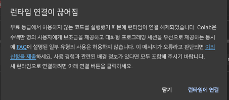 - 코랩 특성상 무료로는 실험이 안될듯.. 런타임이 계속 끊어져서 vscode를 쓸수가 없다. 계속 로드 실패가 뜬다.