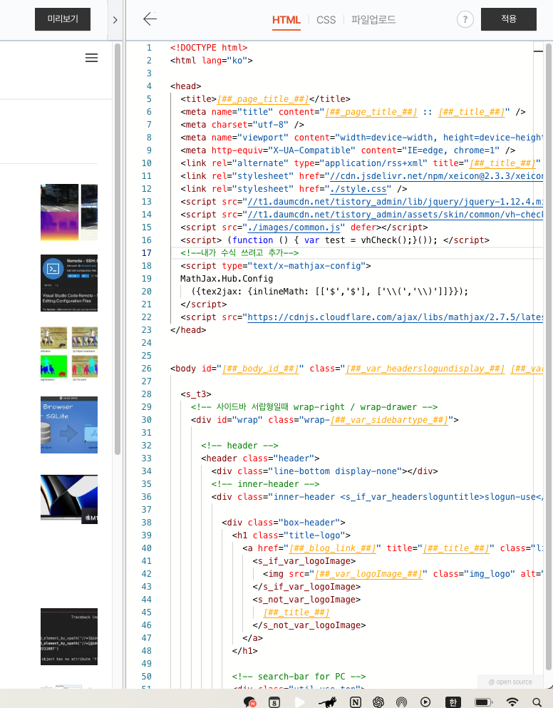 나는 17~22줄에 넣었다. 그러고 적용 버튼 누른다.