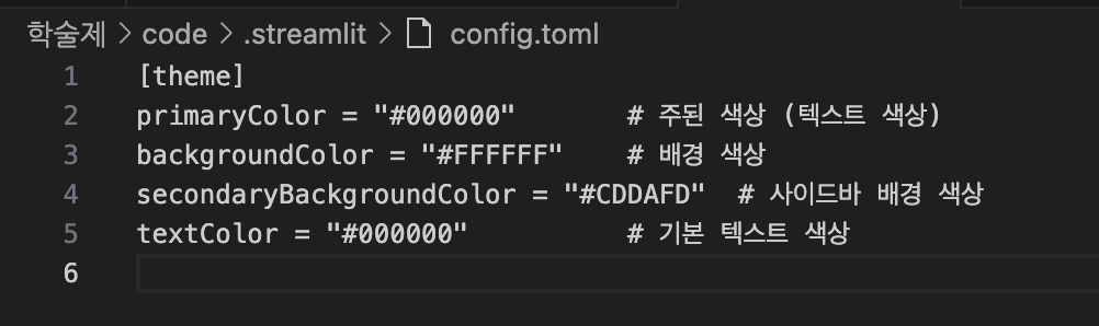 디자인은 config.toml file을 .streamlit 숨겨진 디렉토리를 하나 생성해서 만들면된다.