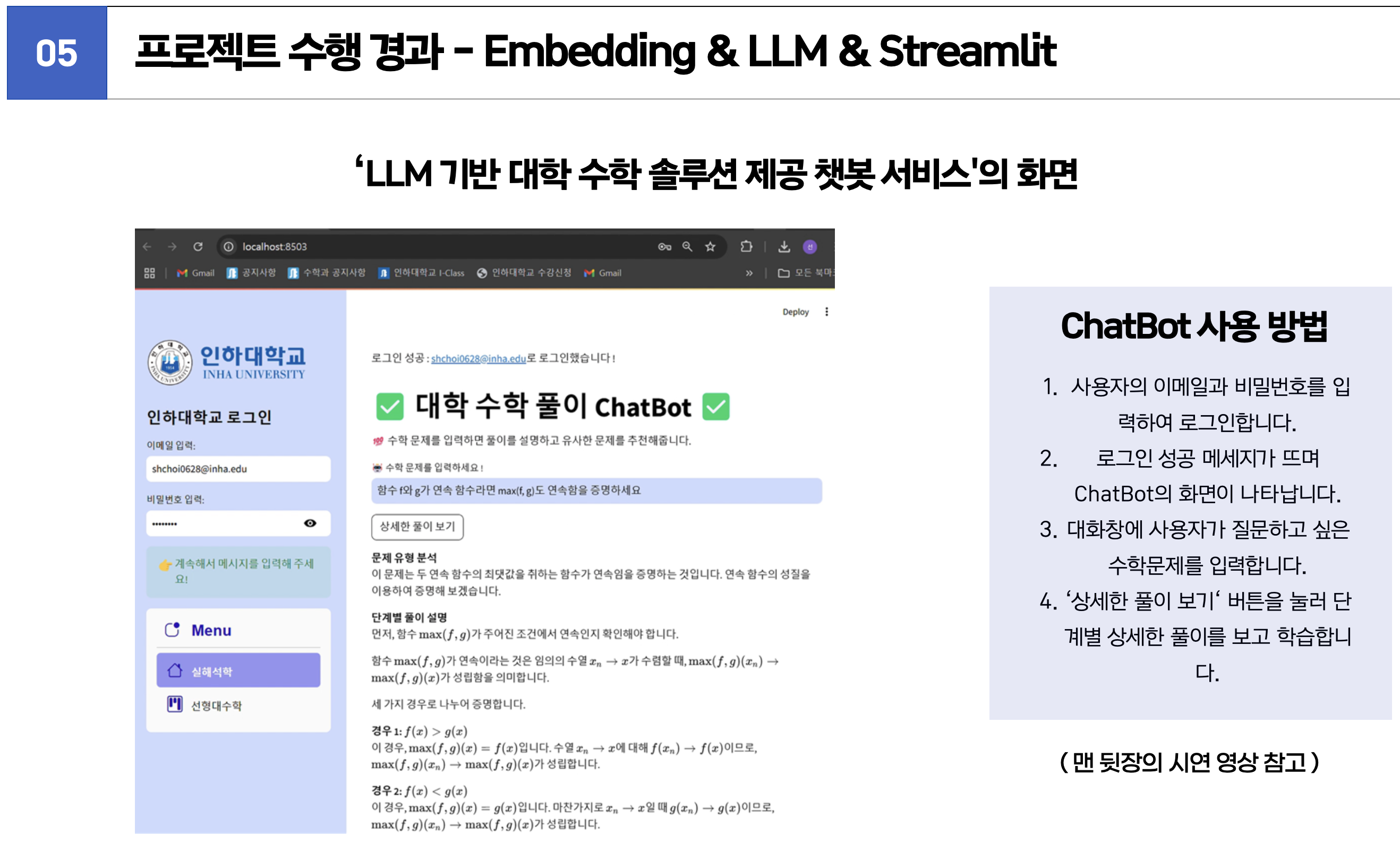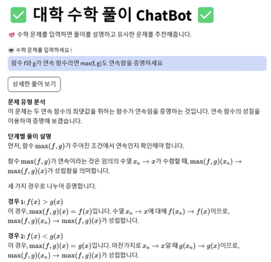 저희는 LLM 기반 대학 수학(실해석학 초점) 솔루션 제공 챗봇 서비스를 개발하였습니다.