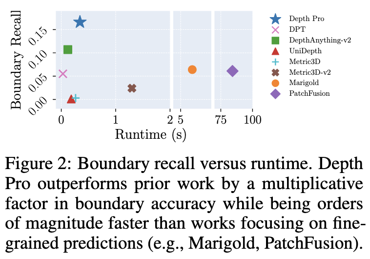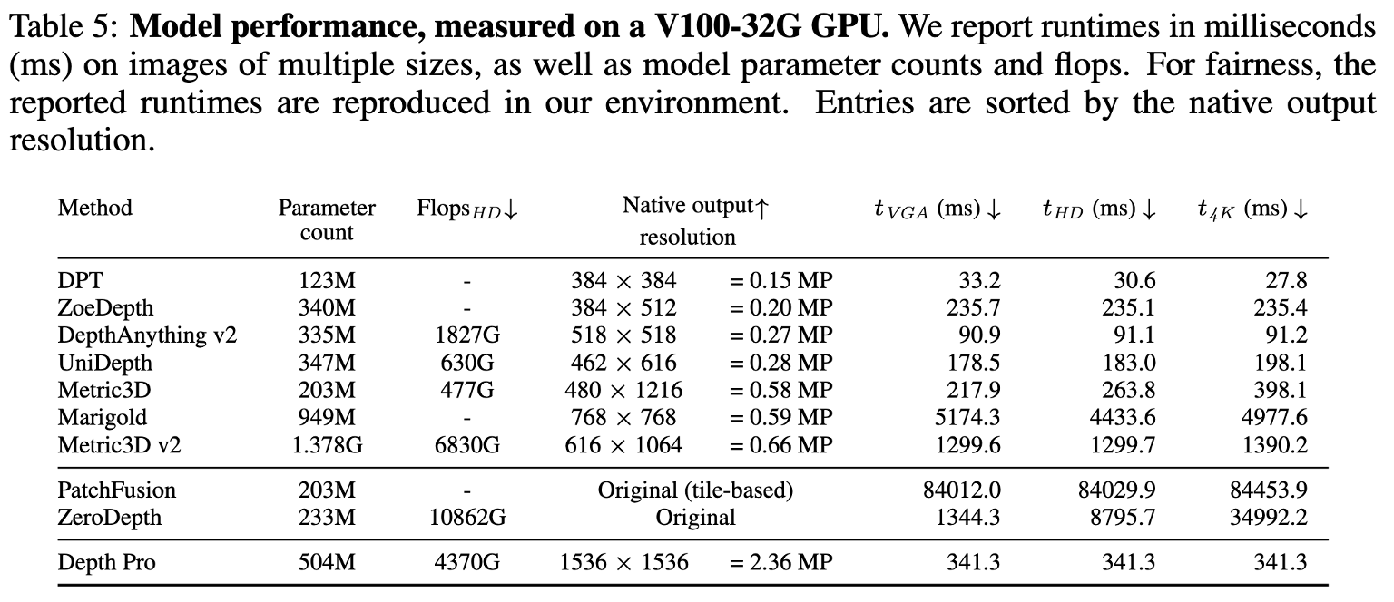 고정 출력 해상도를 가진 모든 접근법 중에서 Depth Pro는 가장 높은 기본 출력 해상도를 가지며, Metric3D v2 (Hu et al., 2024)의 다음으로 많은 픽셀을 처리한다(약 3배 더 많음). 하지만 Depth Pro는 Metric3D v2의 파라미터 개수의 절반 이하를 사용하고, 실행 시간은 1/3에 불과하다.