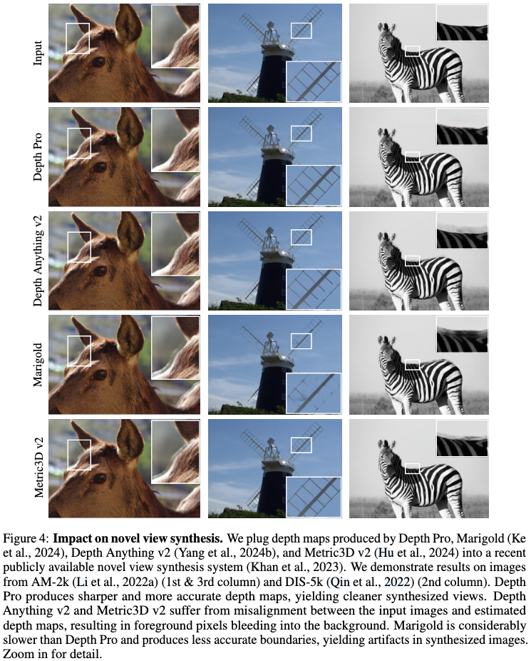 Depth Pro가 모든 데이터셋에서 모든 기준 모델보다 훨씬 더 정확한 경계를 생성한다는 결과가 나왔다. Fig. 1, Tab. 2, 그리고 부록 A에 있는 추가 결과를 보면, 최신 Metric3D v2와 Depth Anything v2 모델들이 경쟁력 있는 계량적 정확도를 보여주더라도 선명한 경계를 생성하지 못한다는 걸 확인할 수 있다. Depth Pro는 머리카락이나 털 같은 얇은 구조에서도 일관되게 더 높은 재현율(recall)을 기록하며, 더 선명한 경계를 만들어낸다. 이는 수십억 개의 실제 이미지로 학습된 사전(prior)을 사용하는 확산 기반 모델 Marigold나 가변 해상도에서 작동하는 PatchFusion과 비교했을 때도 마찬가지다. 또한 Depth Pro의 실행 속도는 Marigold와 PatchFusion보다 훨씬 빠르다(Fig. 2 & Tab. 5 참고). Fig. 4는 단일 이미지에서 새로운 시점을 합성할 때 선명한 경계 예측의 이점을 보여준다.