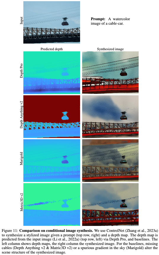 Figure 11: Conditional image synthesis 비교. 우리는 ControlNet(Zhang et al., 2023a)을 사용해 프롬프트(맨 위 행 오른쪽)와 깊이 지도가 주어진 조건에서 스타일화된 이미지를 합성한다. 깊이 지도는 입력 이미지(Li et al., 2022a)(맨 위 행 왼쪽)로부터 Depth Pro와 다른 기준 모델들로 예측된다. 왼쪽 열은 깊이 지도, 오른쪽 열은 합성된 이미지를 보여준다. 기준 모델에서는 Depth Anything v2와 Metric3D v2에서 누락된 케이블이나, Marigold에서 하늘의 잘못된 그라디언트가 합성 이미지의 장면 구조를 변경한다.