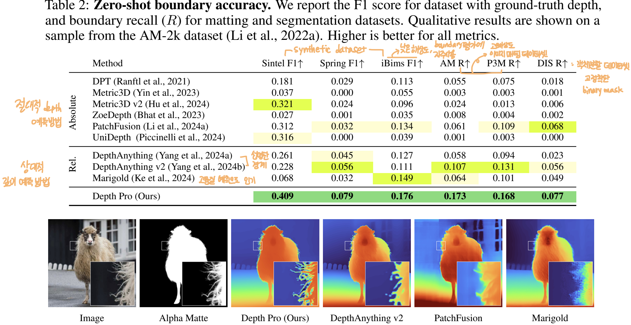참값 깊이(ground-truth depth)가 있는 데이터셋에 대해서는 F1 점수를, 매팅(matting) 및 분할(segmentation) 데이터셋에 대해서는 **경계 재현율(R)**을 보고한다. 정성적(qualitative) 결과는 AM-2k 데이터셋(Li et al., 2022a)의 샘플에서 보여준다. 모든 메트릭은 값이 높을수록 더 좋은 성능을 나타낸다.