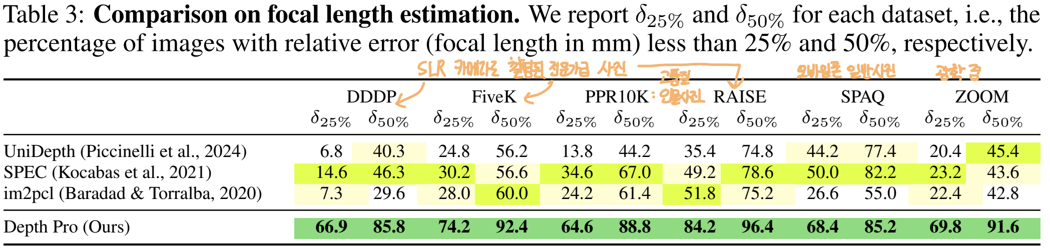 Table 3: 초점 거리 추정 비교. 각 데이터셋에 대해 \delta_{25\%}와 \delta_{50\%}를 보고한다. 여기서 \delta_{25\%}와 \delta_{50\%}는 상대 오차(초점 거리, mm 단위)가 각각 25%와 50% 미만인 이미지의 비율을 나타낸다.