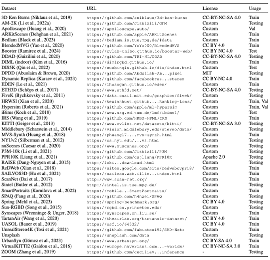 데이터셋에는 합성 데이터셋인 Sintel (Butler et al., 2012)과 Spring (Mehl et al., 2023)이 포함된다. 또한 iBims 데이터셋(Koch et al., 2018)도 포함되는데, 이는 낮은 해상도에도 불구하고 깊이 경계 평가에 자주 사용된다. iBims와 관련된 모든 메트릭은 부록에 있다.