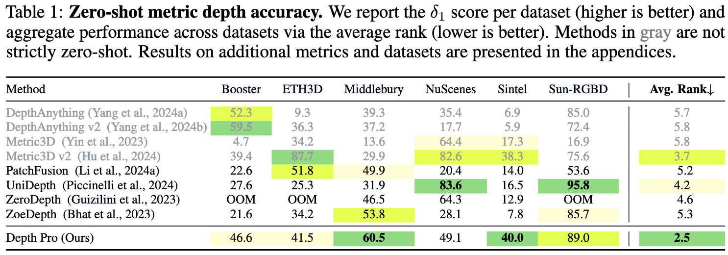 위 : Tab. 1: 제로샷 계량적 깊이 정확도