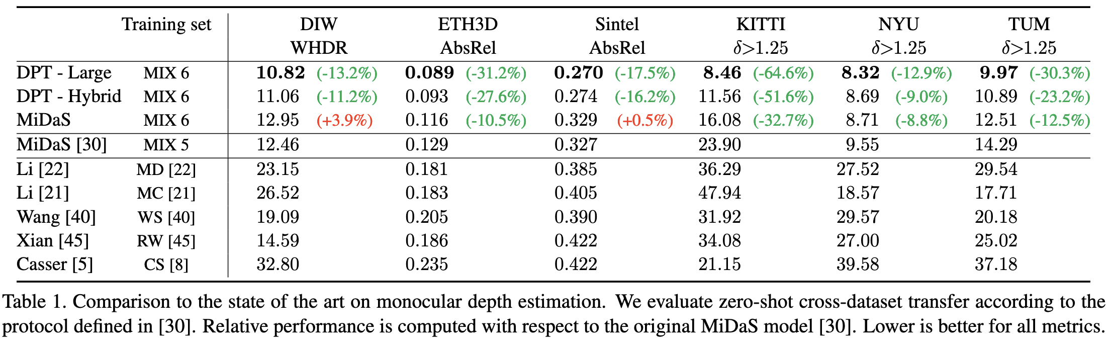 Table 1은 학습 중 보지 않은 다양한 데이터셋에 대한 Zero-shot 전이를 보여줍니다. 모든 메트릭에서 낮을수록 더 나은 성능을 의미합니다. DPT의 두 가지 변형은 모두 최첨단을 크게 능가합니다. 평균 상대적 성능 향상은 DPT-Hybrid가 23%, DPT-Large가 28% 이상입니다.