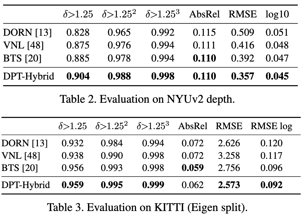 우리는 DPT를 두 가지 밀도 예측 작업에 적용했습니다: 단안 깊이 추정(Monocular Depth Estimation)과 의미 분할(Semantic Segmentation). 두 작업에서 DPT는 유사한 용량을 가진 컨볼루션 네트워크와 비교하여 특히 대규모 학습 데이터셋이 주어졌을 때 정확도를 크게 향상시킬 수 있음을 보여줍니다. 먼저 기본 설정을 사용한 주요 결과를 제시하고, 이 섹션의 마지막 부분에서 DPT의 다양한 구성에 대한 포괄적인 분석을 제공합니다.