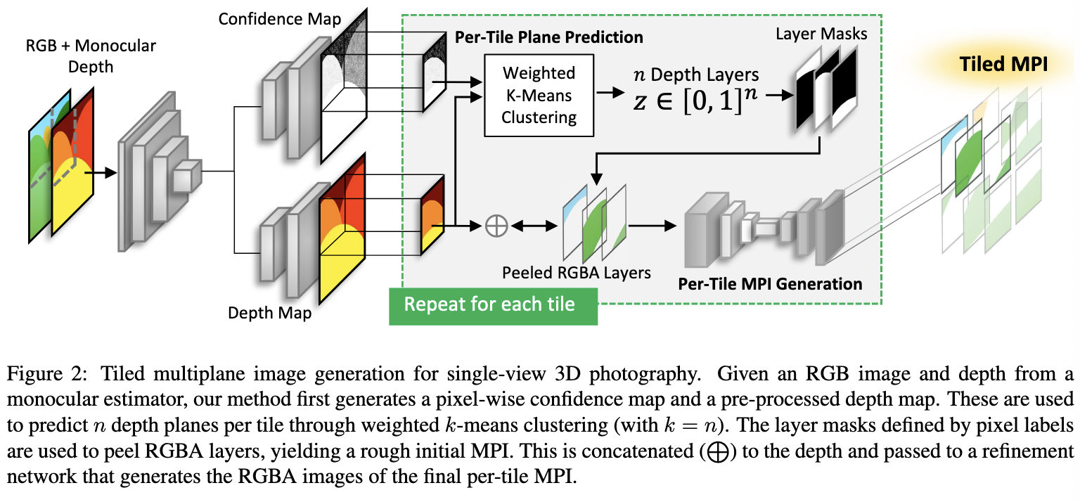2. 3D photography를 위해 single RGB input으로부터 tiled multiplane images를 생성하기 위한 learning framework