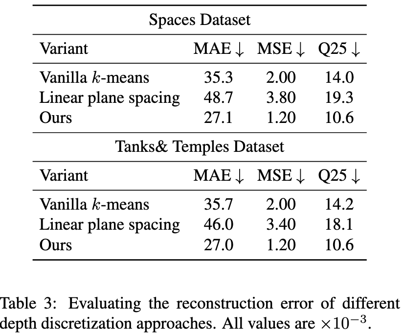 - monocular depth input에 작은 양의 Gaussian noise(λ = 0, σ² = 1×10⁻³)가 추가된 상황에서 각 타일의 평면으로 정의된 discretized depth map의 복원 품질을 측정한다. 우리는 이 접근법을 inverse disparity space에서 depth planes을 선형적으로 간격을 두는 단순한 방식과 vanilla unweighted k-means기본적인 비가중치 k-평균과 비교한다.