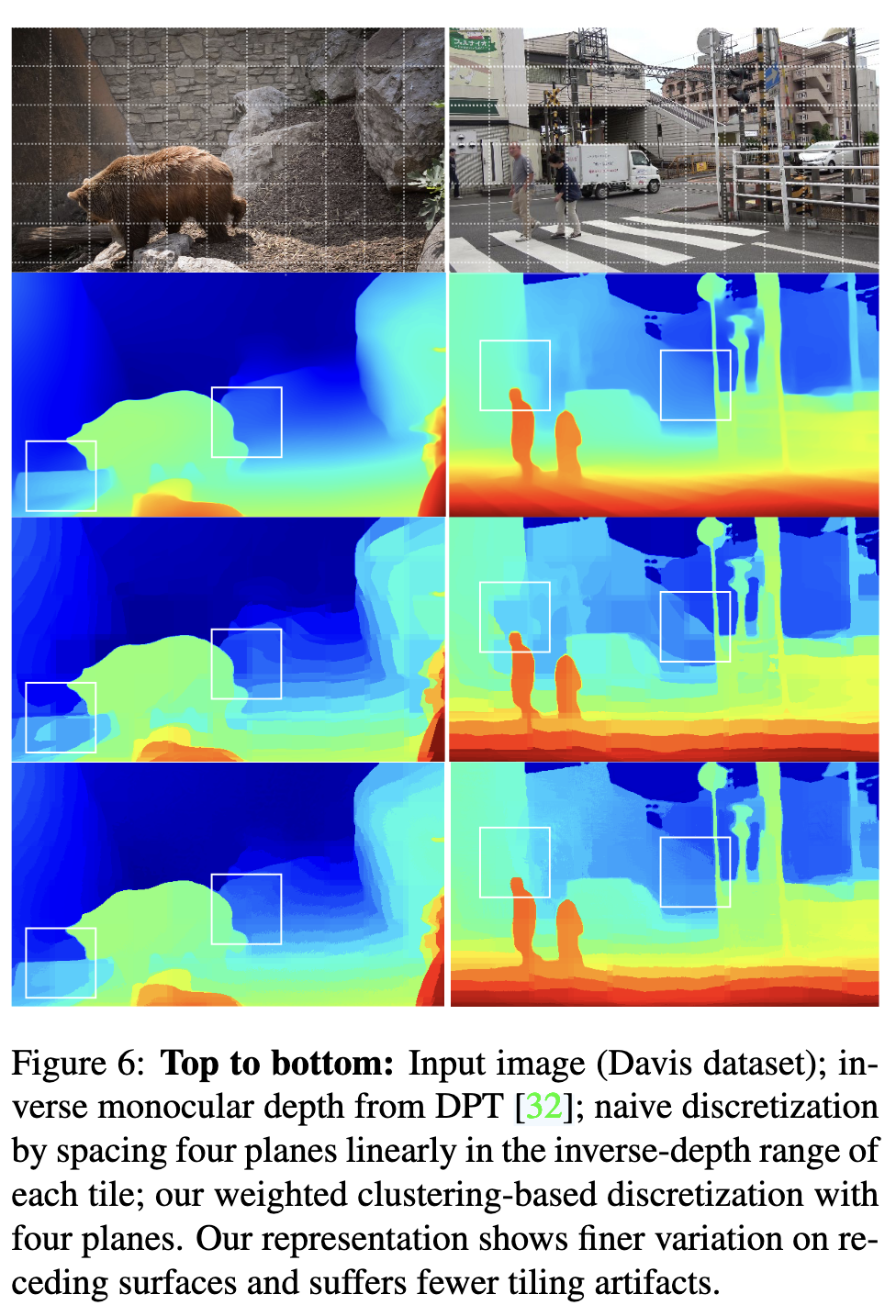 Figure 6: 위에서 아래로: 입력 이미지 (Davis 데이터셋); DPT [32]로부터의 역 단안 깊이; 각 타일의 역-깊이 범위에서 네 개의 평면을 선형적으로 배치하여 만든 단순한 이산화(discretization); 가중치가 적용된 클러스터링 기반의 네 개 평면으로 구성된 우리의 이산화 방식. 우리의 표현은 후퇴하는 표면(receding surfaces)에서 더 세밀한 변화를 보여주며, 타일 아티팩트(tiling artifacts)가 적게 발생한다.