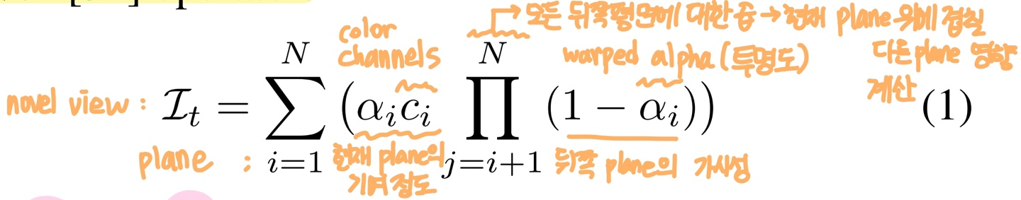 - 장면을 stack of fronto-parallel RGBA planes으로 정의하며, 이를 warped왜곡하고 novel viewpoints에서 렌더링가능 [53, 26, 9]
