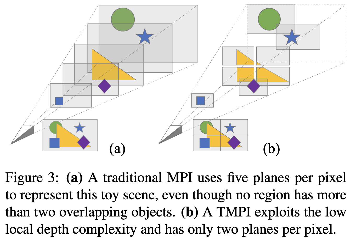 -> Tiled Multiplane Image (TMPI) : MPI를 많은 작은 tiled regions으로 나누고 각각 몇 개의 depth planes만 갖도록 함