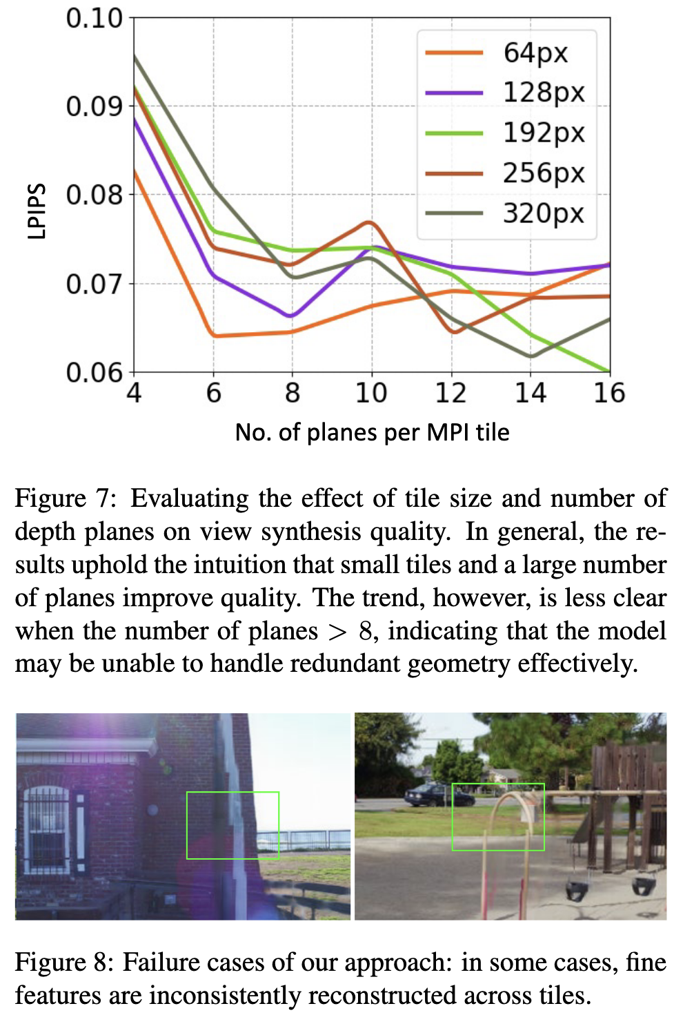 - Figure 7은 타일 크기와 plane 수가 view synthesis 품질에 미치는 영향을 평가한다.