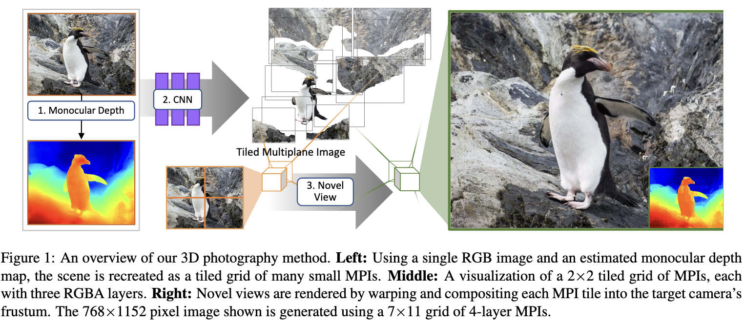 single RGB 입력에서 tiled multiplane images를 추정하는 3D photography 방법을 제안한다.