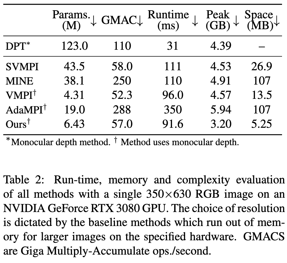 - VMPI, AdaMPI, 우리의 방법은 Ranftl 등 [32]의 DPT를 사용한 monocular depth estimation의 additional overhead를 가진다.