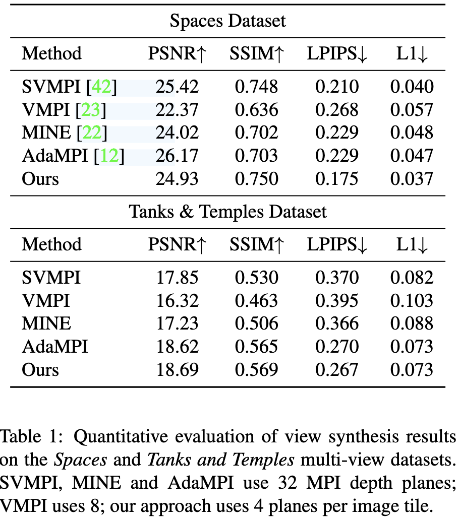 - 타일당 fewer planes훨씬 적은 평면 수를 가졌음에도 불구하고 우리의 방법이 경쟁력 있는 성능을 보이는 이유는 각 타일에서 adaptive placement of depth planes하여 기준 방법의 single MPI보다 더 넓은 depth range 를 효과적으로 커버할 수 있기 때문.