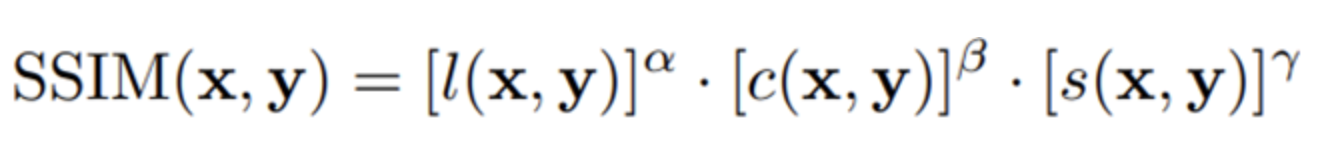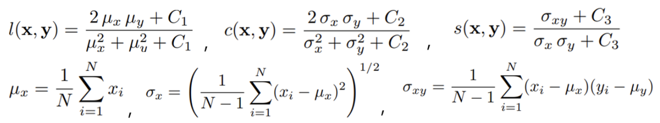 - 두 이미지(x, y) 간의 상관계수를 Luminance(휘도), Contrast(대비), Structure(구조) 총 3가지 측면에서 평가합니다. (α=β=γ=1)