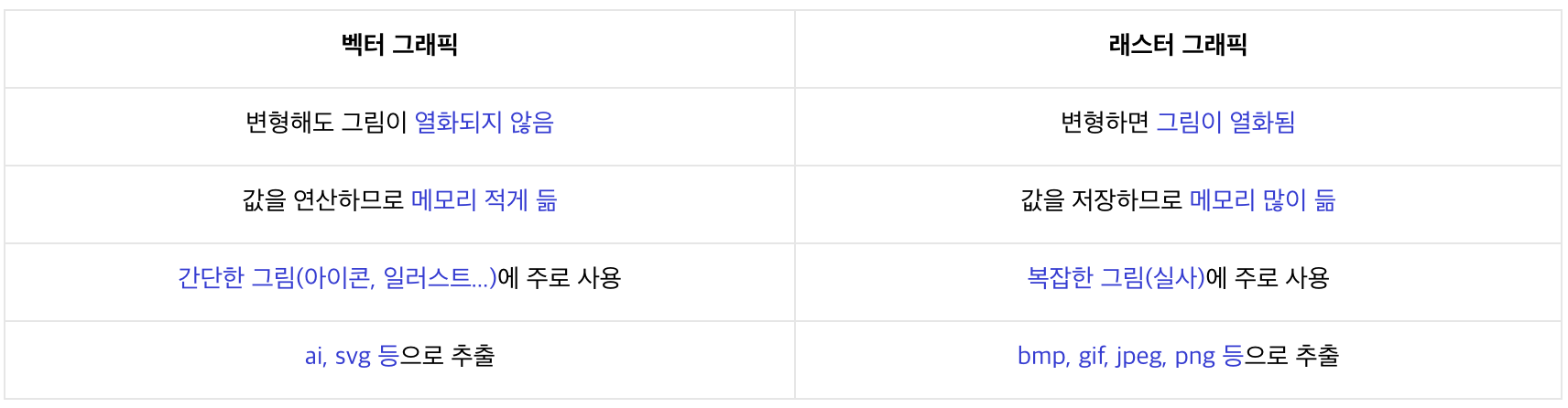 - 벡터 그래픽스는 확대/축소 시 해상도 손실이 없으며, 주로 로고, 아이콘, 일러스트 등에 사용된다.