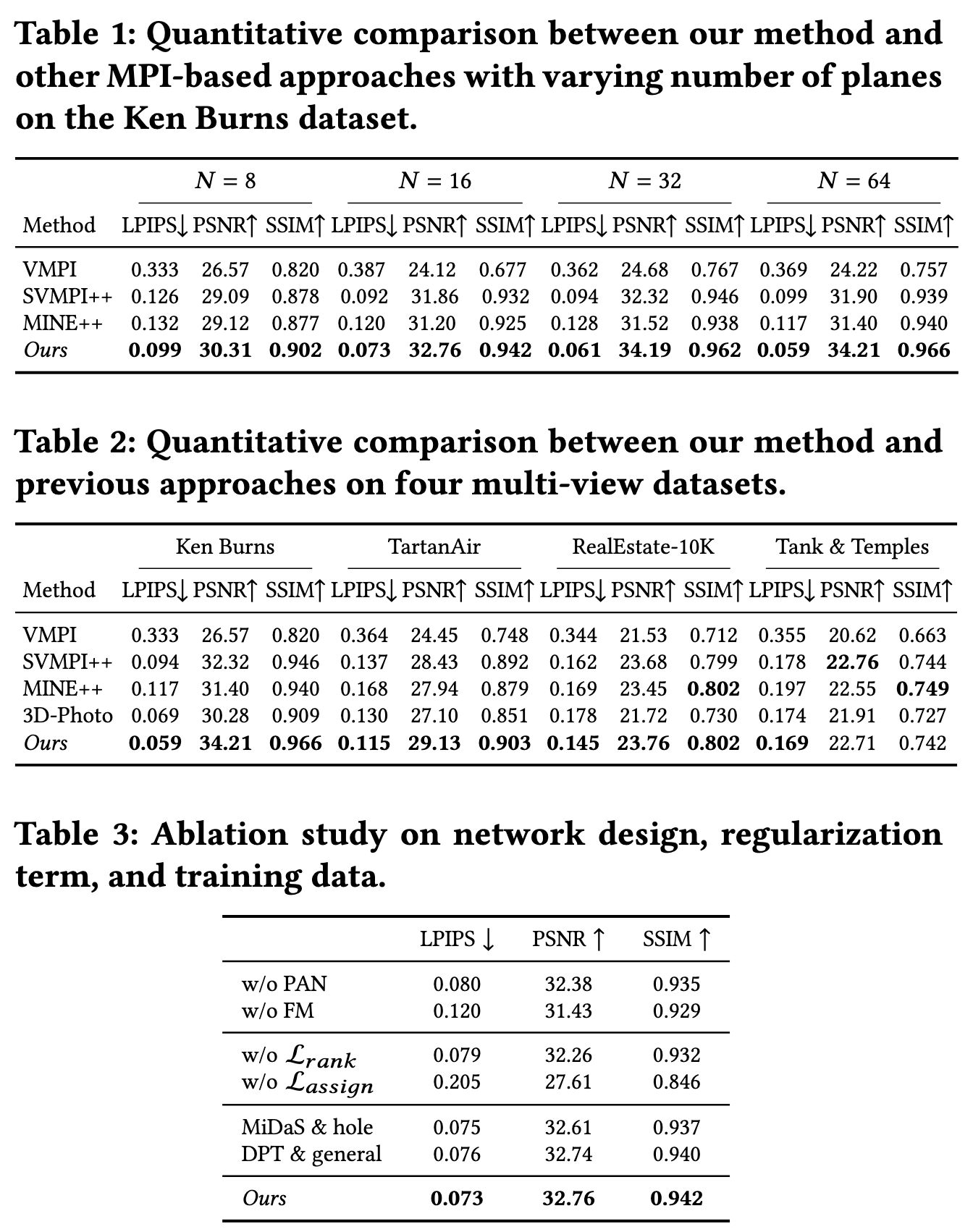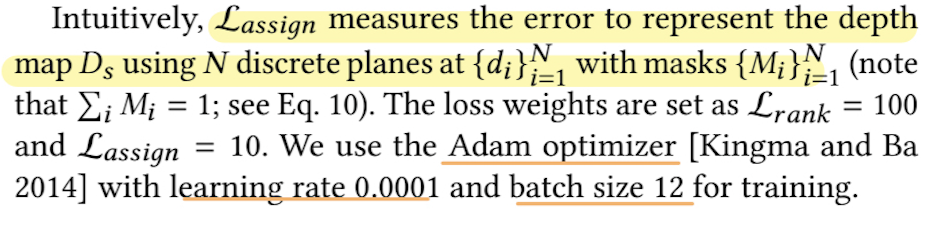 \( L_{\text{total}} = (1.0 \cdot L_{L1} + 1.0 \cdot L_{\text{SSIM}} + 0.1 \cdot L_{\text{VGG}} + 10.0 \cdot L_{\text{focal}} + 1.0 \cdot L_{\text{depth}}) + (100 \cdot L_{\text{rank}} + 10 \cdot L_{\text{assign}}) \)