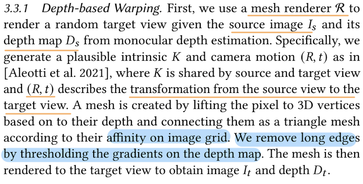 Stage2에서의 Warp(변환) 은 실제로 원본 이미지에 대해 3D 기하학적 변환 (camera extrinsic 변화) 를 적용해서 다른 시점에서 본 것처럼 만드는 과정