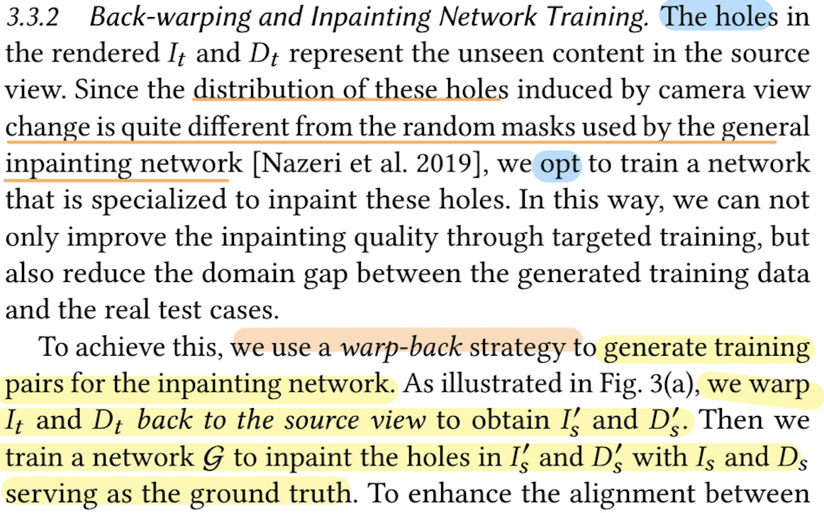 • 기존 일반적인 인페인팅 네트워크는 랜덤한 마스크(구멍)에 대해 학습하지만, Warp-Back에서는 카메라 이동으로 인해 발생하는 홀만을 특화하여 학습합니다.