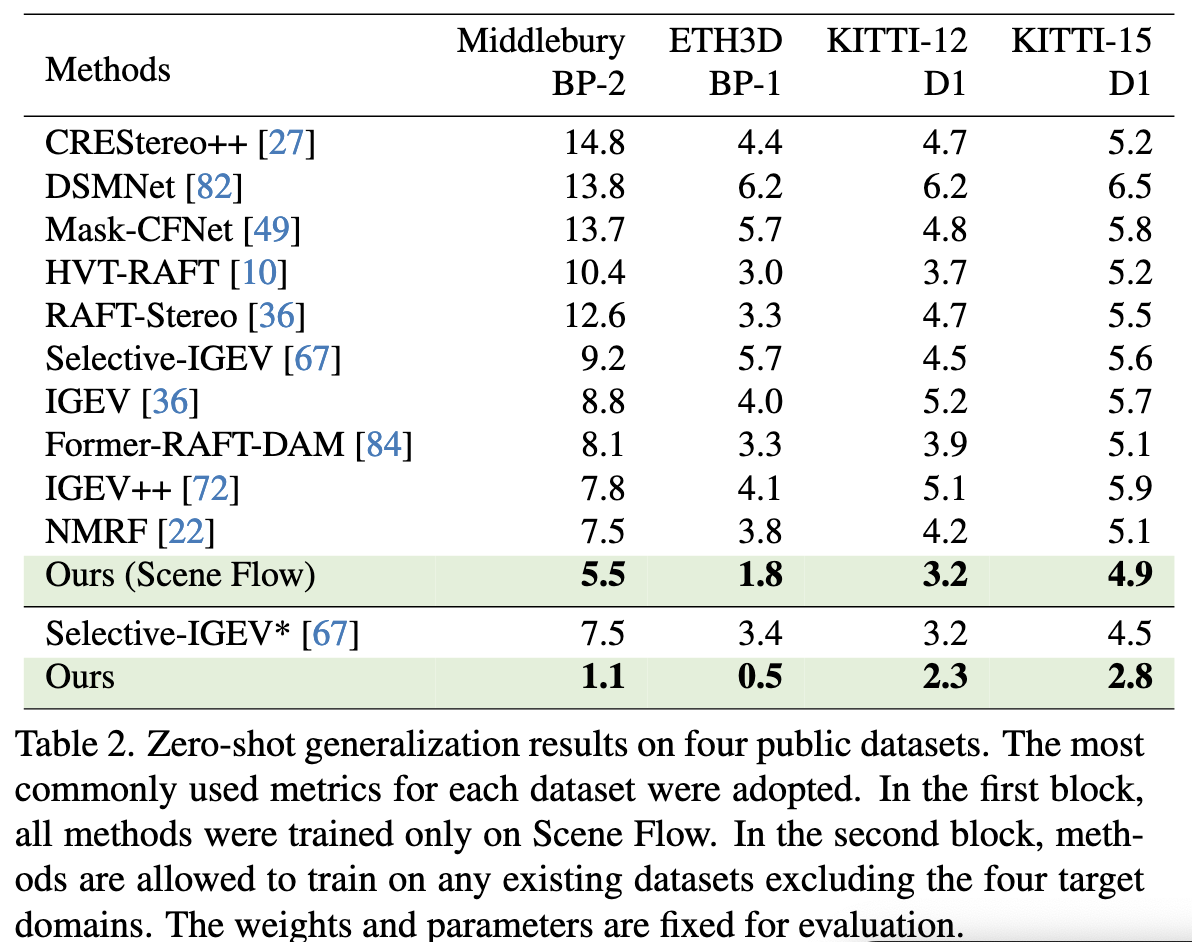 하지만, 다른 computer vision task에서 foundation model의 특징으로 여겨지는 강력한 zero-shot generalization을 stereo matching에서 달성하는 것은 여전히 어려운 과제임.