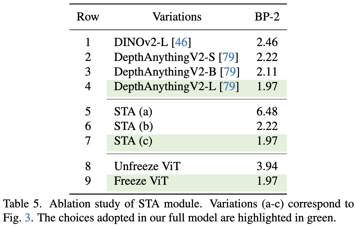 Tab. 5에서 보이듯, 먼저 rich monocular prior를 적용하기 위해 다양한 vision foundation model을 비교함.