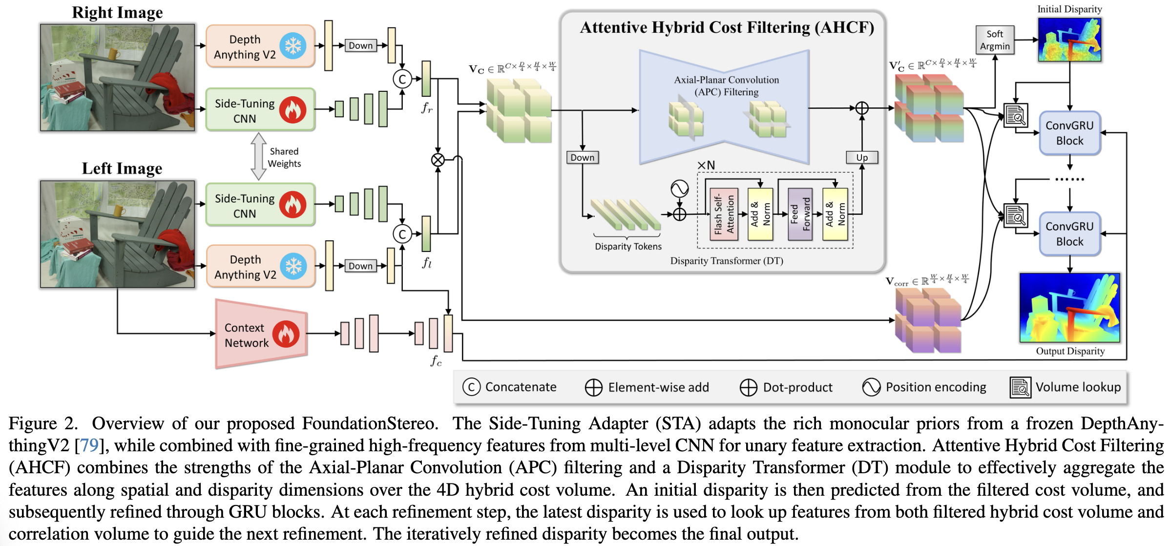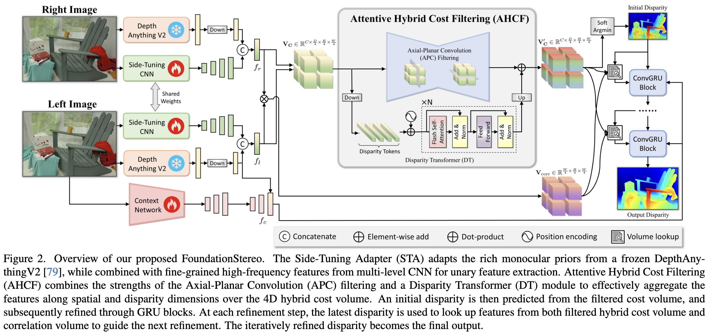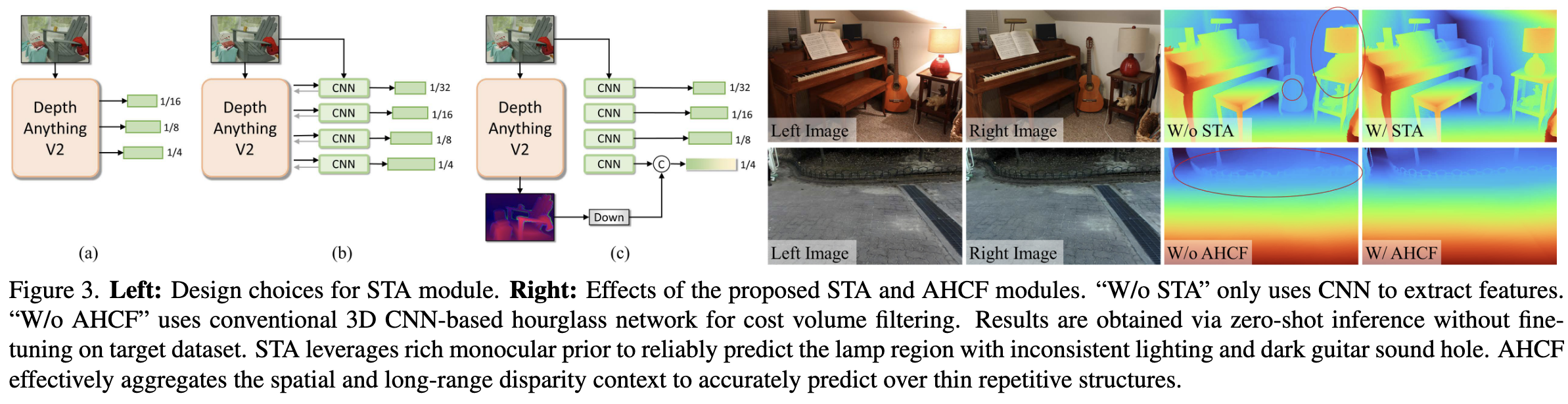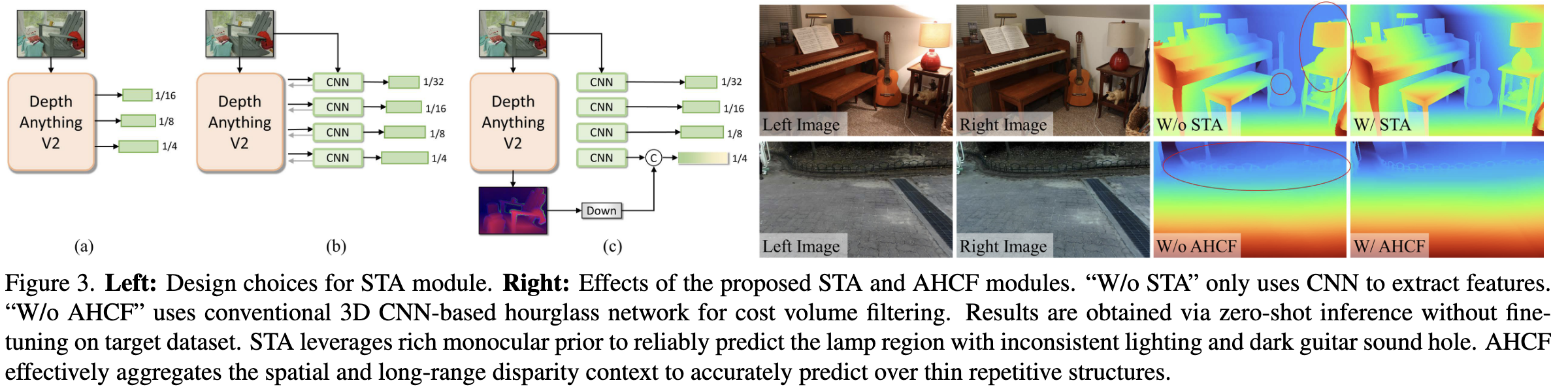 여기에는 sim-to-real gap을 줄이기 위해 vision foundation model에서 가져온 rich monocular prior를 적응시키는 side-tuning feature backbone, 그리고 효과적인 cost volume filtering을 위한 long-range context reasoning이 포함됨.