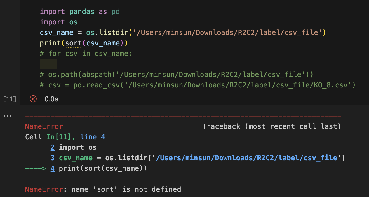 csv를 읽어서 sort() 정렬하려하는데 NameError: name 'sort' is not defined 라고 뜬다면?error 이유 : sort() 메서드는 파이썬 리스트에만 적용된다.여기서 csv_name은 디렉토리 내 CSV 파일의 이름을 포함하는 리스트로 정의했다.csv 리스트를 정렬하려면 sorted() 함수를 사용해야 한다. import pandas as pdimport oscsv_name = os.listdir('/Users/minsun/Downloads/R2C2/label/csv_file')print(sorted(csv_name)) #수정한곳​  이렇게 하면 csv_name 리스트의 요소들이 정렬된 새로운 리스트로 출력된다.